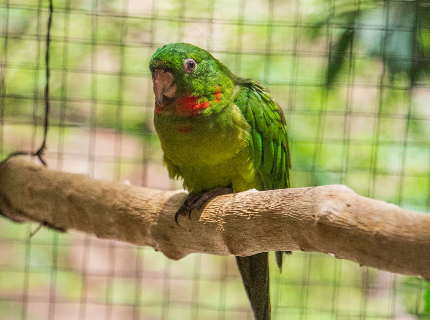 • Morphology:The red-throated parakeet averages 28 cm in length, including their long tail. Their average weight is 130 g. They have a mostly green plumage, except their distinctive orange-red throat and foreneck, and scattered orange/yellow feathers on lower cheeks and the sides of neck. The underparts are yellow. They have yellow-green underwing coverts and the undersides of the flight feathers are dull yellow. The bill is horn-colored. They have bare, brown-grey eye rings and orange eyes.